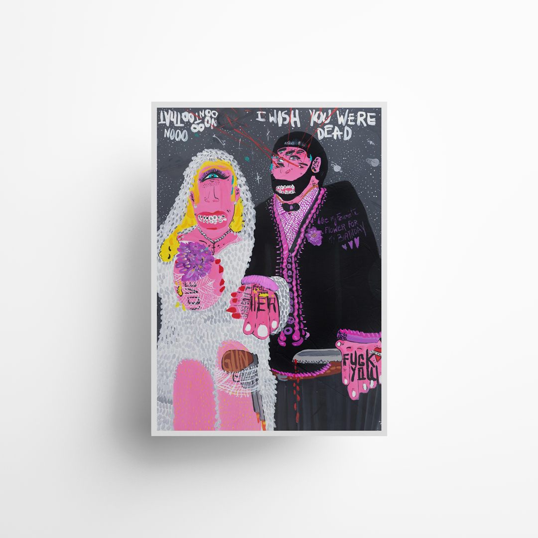 Ce print tiré d’une oeuvre originale capture un duo aussi fascinant que dérangeant : une mariée en blanc, radieuse et menaçante, et un homme en noir, tatoué de messages ambivalents. Entre eux, un dialogue visuel explosif, où les mots « I WISH YOU WERE DEAD » côtoient des « LOVE YOU FOREVER » et des « FUCK YOU », le tout baigné dans une palette de rose bonbon, de violet et de noir profond.